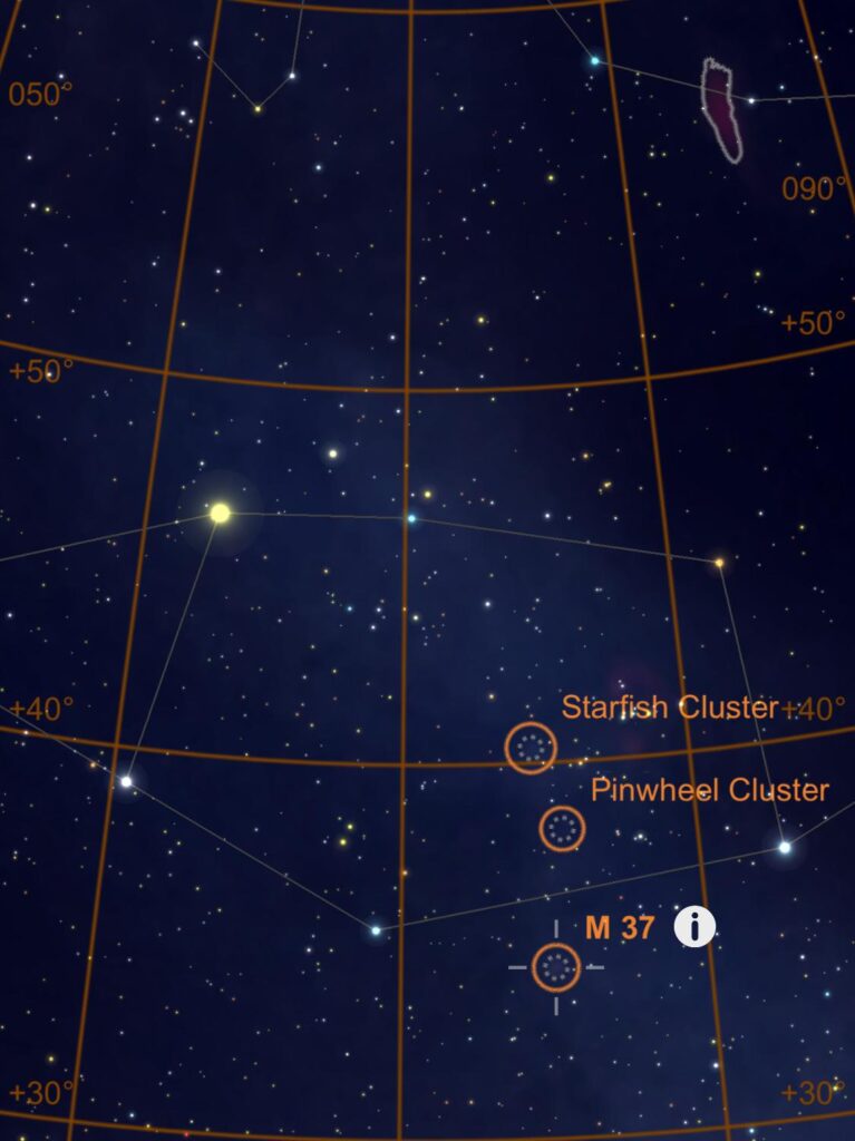 Capella, la sisena estrella més brillant del cel, marca el punt nord del polígon. A l’est de Capella hi ha Menkalinan (Beta Aurigae) i al sud de Menkalinan hi ha Mahasim (Theta Aurigae). M37 es troba a l’est del punt mitjà de la línia traçada des de Mahasim fins a Elnath a Taure, que es troba al sud-oest. Sent el més oriental dels tres cúmuls de Messier d’Auriga, M37 és l’únic que es troba fora de l’hexàgon d’Auriga.